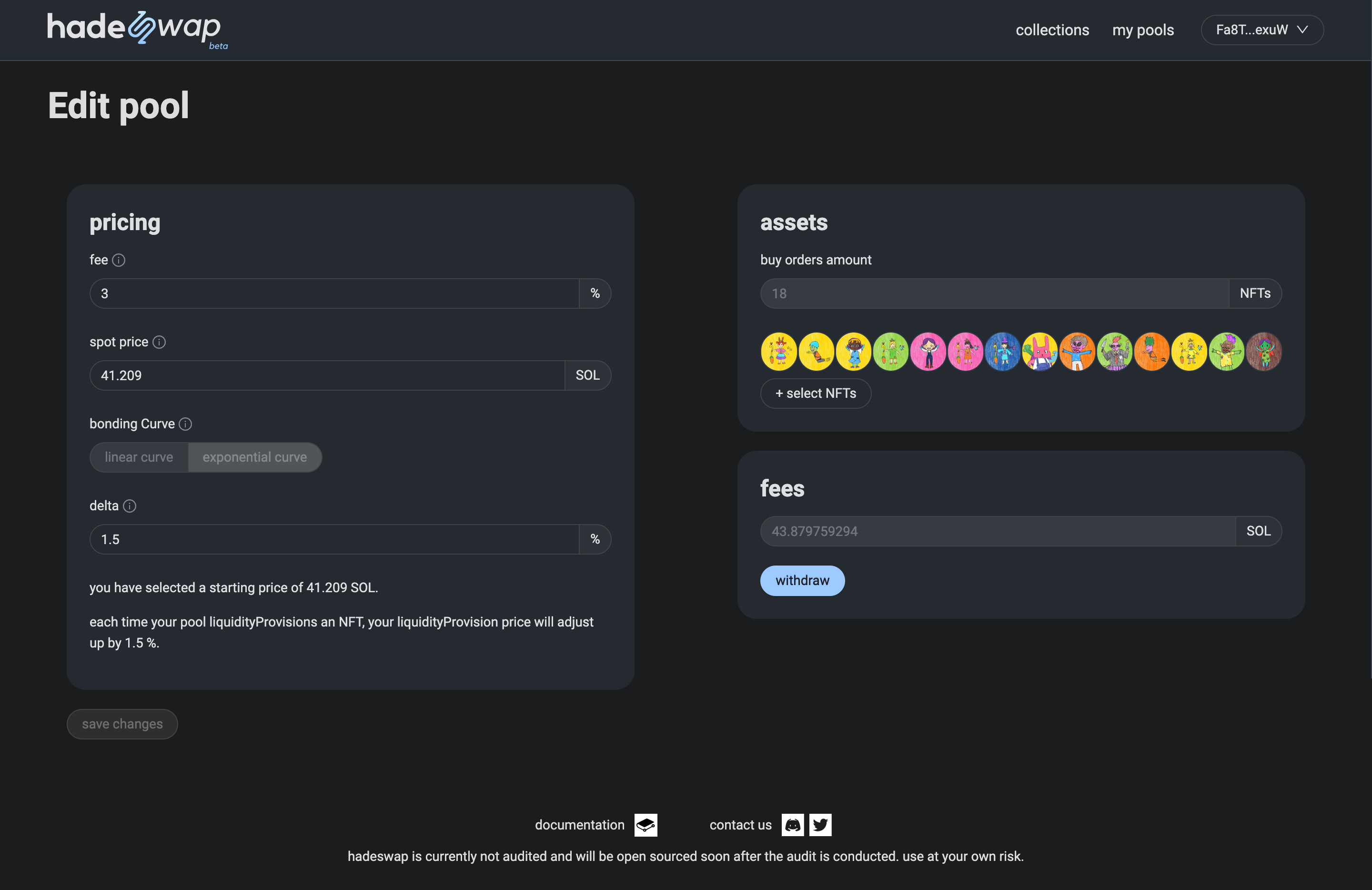 2. Pick the NFT liquidity pool you'd like to withdraw your hard-earned fees from and once you get on the page of your liquidity pool, press "<mark style="color:blue;">withdraw</mark>".&#x20;